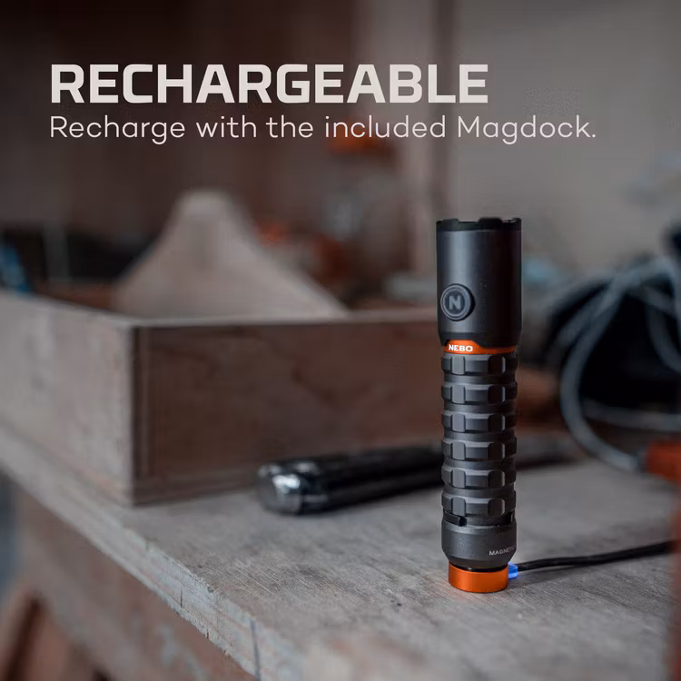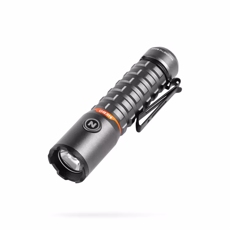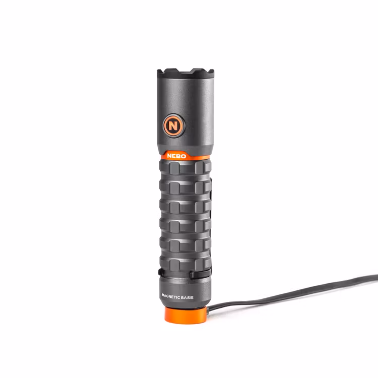 NEBO TORCHY 2K är en liten kraftfull uppladdningsbar ficklampa, endast 10,87 cm lång, med hela 2000 lumen. Laddningen sker smidigt via magnetisk USB, detta innebär också att botten är magnetisk, vilket gör hands-free användning möjlig. Denna kraftfulla ficklampa har ett avtagbart 2-vägs clips för bekväm användning och handsfree-belysning vid fastsättning i t.ex. kepsskärm. Torchy 2K är vattentätt (IPX6) och är utrustat med 5 ljuslägen som övergår sömlöst via Smart Power Control. Den bakgrundsbelysta knappen fungerar som ström-, batteri- och laddningsindikator.